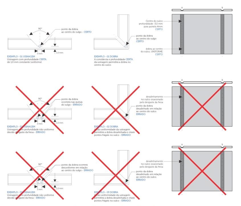 Após a execução do sulco com uniformidade e profundidade correta, a execução da dobra do painel deve ser realizada de uma só vez, em movimento único, ou seja, com o auxílio de um gabarito de dobra. Este procedimento evita a torção do painel, quando executado a dobra em partes (principalmente em módulos grandes) pode gerar um desalinhamento da junta na quina (canto da dobra) conforme exemplifica a figura 02, exemplos 02 e 03.