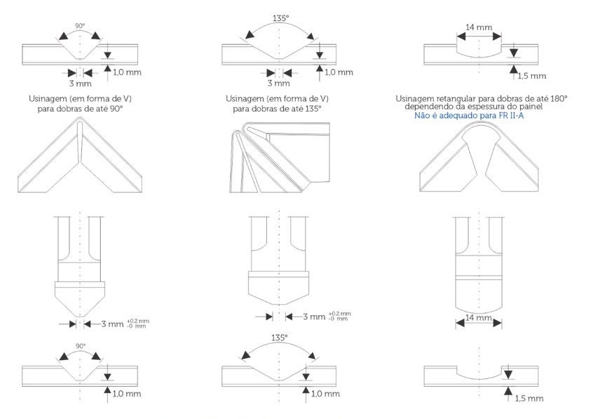 Dentre os diversos tipos de conformação, a usinagem para dobras talvez seja o procedimento mais comum nas instalações em geral. A usinagem é realizada desbastando-se a lâmina de alumínio inferior do painel (face interna) e parte do núcleo de polietileno de baixa densidade, auto-extinguível (LDPE IV-A) ou mineral antichamas (Fire Retardant FR II-A, ou retardante de fogo, em português). O sulco executado deve ter uniformidade na profundidade para se obter uma dobra alinhada, evitando problemas associados a perda de planicidade do módulo, fissuras na tinta/acabamento, desalinhamento ou ruptura na dobra. A usinagem deve ter profundidade de 1 mm, contados a partir da extremidade da lâmina acabada (face externa), conforme exemplificado na figura 01.