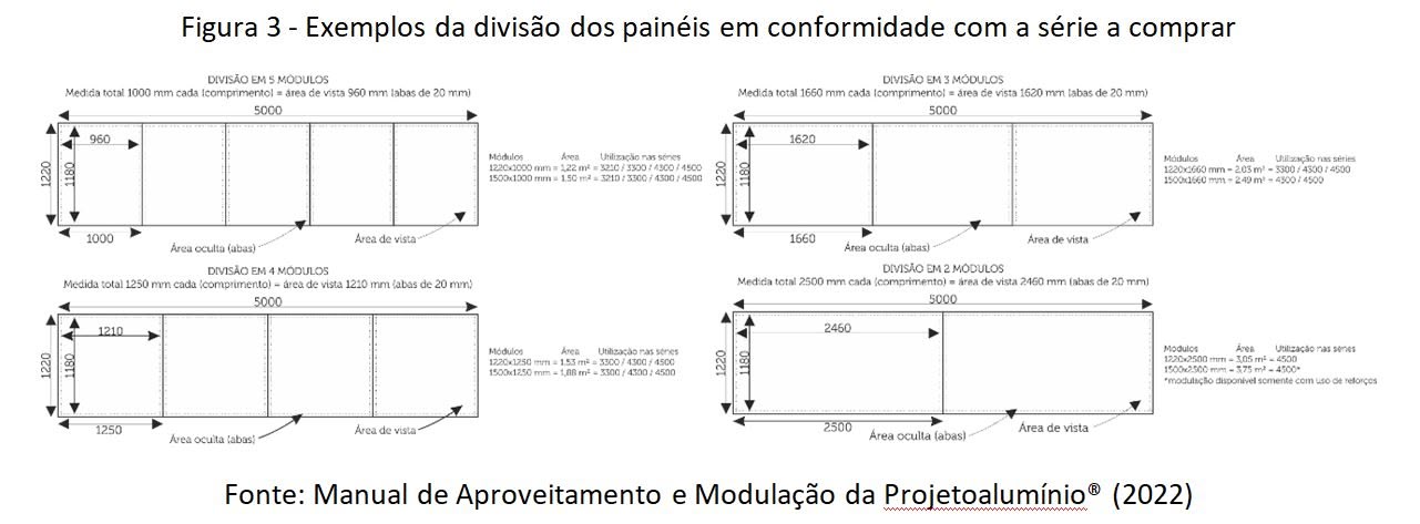 A divisão dos painéis de 5000mm de comprimento por três, ou seja, em três partes de 1666mm é a melhor solução técnica e pode ser aplicável na maioria das obras e séries 4300 e 4500. Esta divisão, além de ser otimizável no comprimento evitando perdas, é prática para instalação, pois os módulos são manuseados mais facilmente, principalmente em fachadas altas.