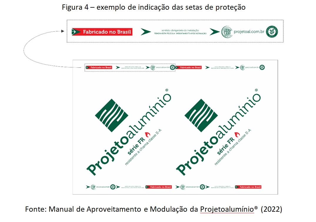 Durante o cálculo de aproveitamento é importante observar o sentido da paginação (setas impressas no filme de proteção), conforme mostra a figura 4, pois não é permitido a rotação dos módulos no mesmo plano de trabalho.